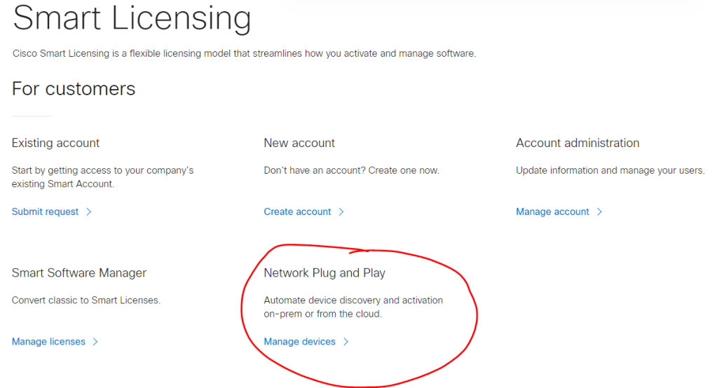 To check, navigate to https://software.cisco.com and sign in with your Cisco CCO. You are probably familiar with this site if you had to license a device with the smart licensing server. Scroll down towards the bottom of the home page, and under the “Smart Licensing” section you will see the Network Plug and Play link. Click “Manage devices”