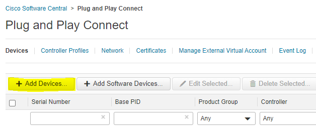 Next make sure the correct Smart account and Virtual account are selected in the upper right corner, then under the “Devices” tab you should see a list of all the routers registered with PnP. If you do not see your router, or any router for that matter then you will need to manually add the router(s). Luckily this is pretty easy to do: