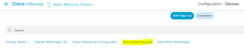 Under the “WAN Edge List” tab click the “Sync Smart Account” link on the top bar of the page. You will be asked to sign into the smart account using a username and password. These credentials are not saved by vManage, only used for the single sync task, so it is ok to use the same CCO used to add the devices to PnP.