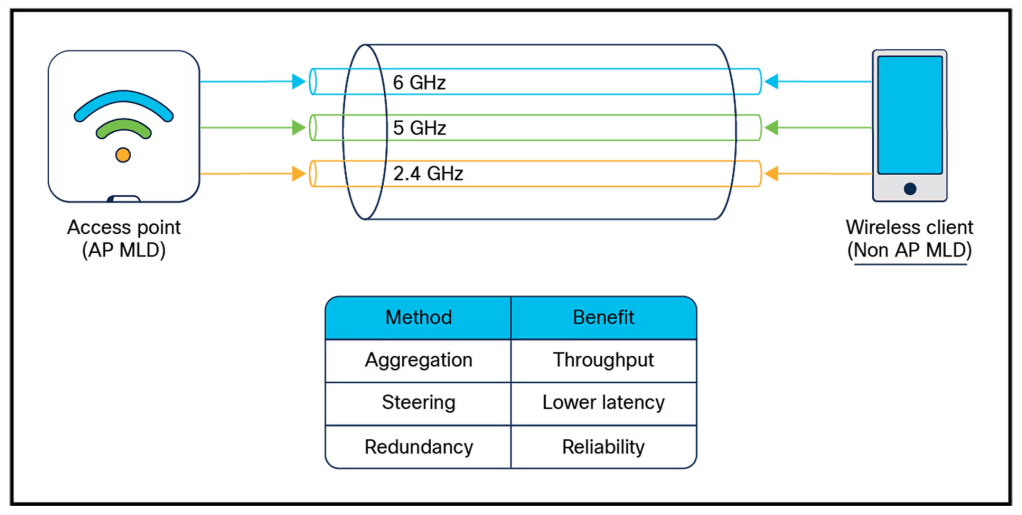 - Multi-Link Operation (MLO): MLO allows devices to both transmit and receive data at the same time using multiple links to increase throughput and reliability.