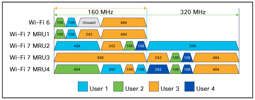Wifi-6 APs with multiple clients can assign difference clients to different RUs allowing for simultaneous transmission of data for each client. The Wifi-6 standard only allows a single client to get assigned to a single RU. With Multiple RUs (MRU) Wifi-7 now allows for a single client to receive multiple RU subcarriers to use for upload and download transmission. The Access Point can now assign unused RUs to clients for increased bandwidth and allows the client to choose clearer subchannels and theoretically reduces latency by up to 25% from the standard single RU of OFDMA defined in Wifi-6.