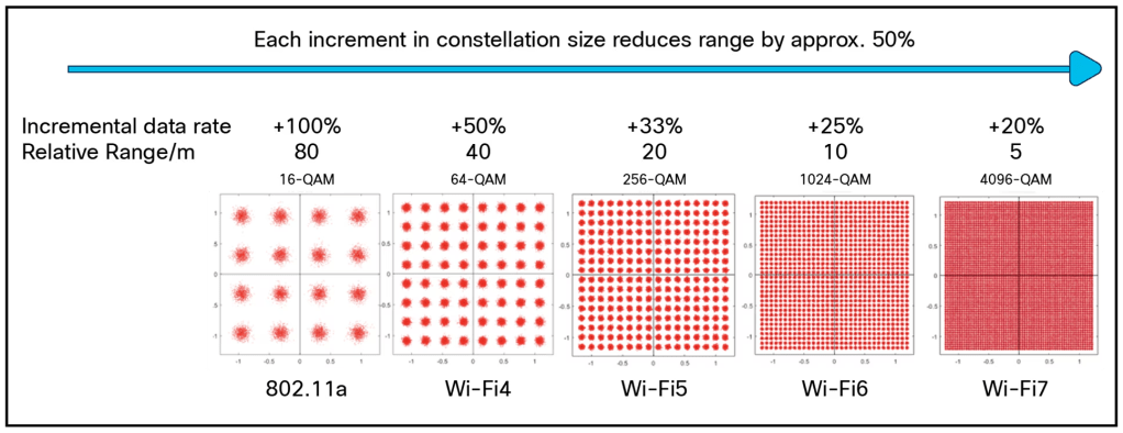 To compare Wifi-6 and Wifi-7; Wifi-6 had a maximum QAM modulation of 1028 states (1028-QAM); which allowed for each state to represent a maximum of 10 bits per state. So with 4096-QAM we see a 20% increase in the data transmission rate.